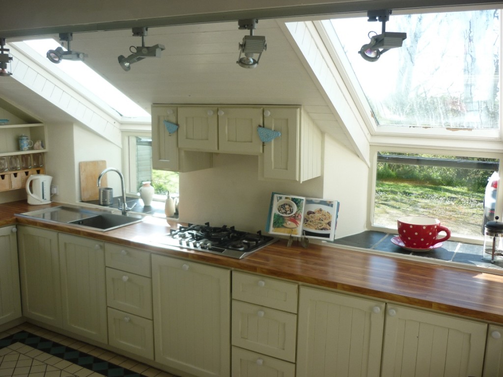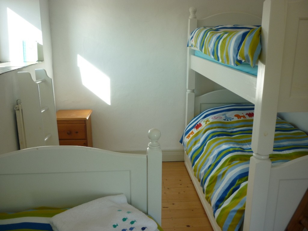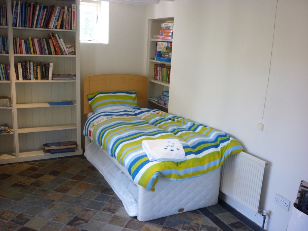 Sleeping up to 9 or 10 persons, the property has a ground floor double room with en suite, a walk through book room which can double up as a 4th bedroom with a single plus a pull-out truckle bed adjacent to a second east facing vaulted conservatory which has views out towards Spain Tower. Upstairs there is a double room with large mezzanine dressing room, a family bathroom and a children’s bedroom that sleeps 4 with a single bed, bunk beds, a truckle bed and a mezzanine play area accessed by stepladder.