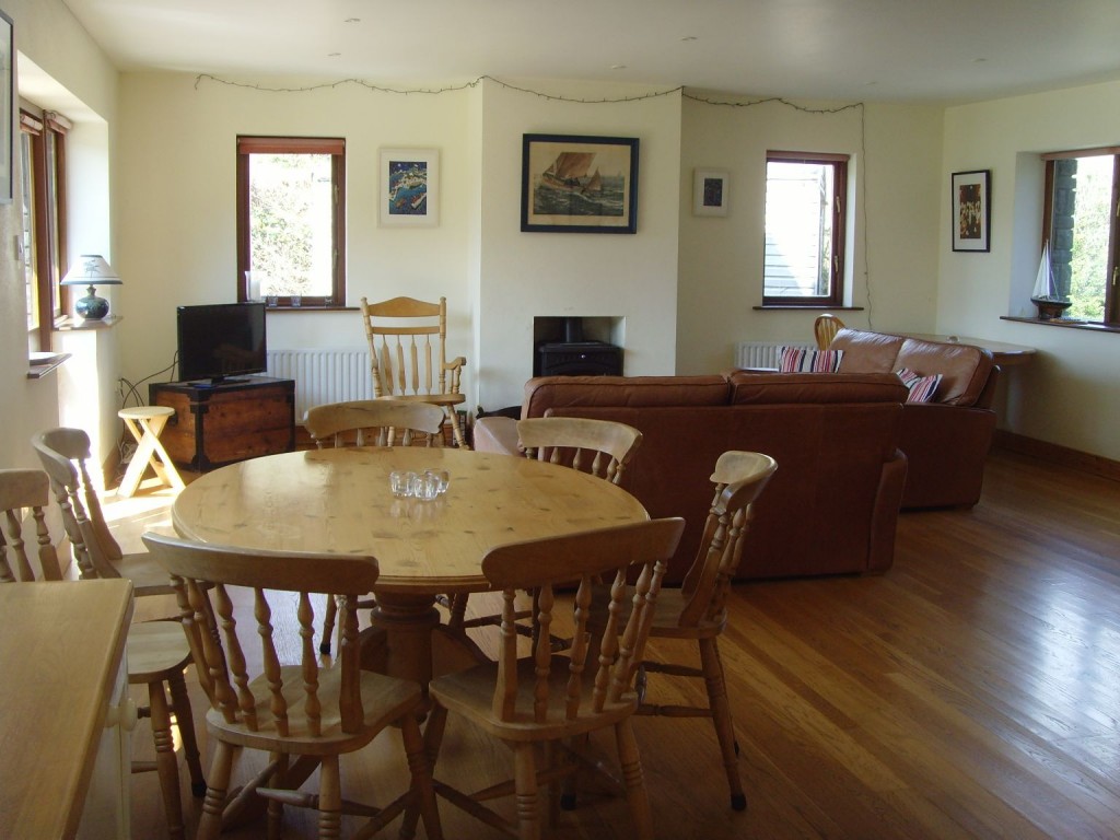 A modern stone built four bedroom detached chalet style residence nestled in an amazing spot between the Cove and Tranadroum beaches and benefitting from gorgeous views out over the sea towards the Beacon. Sleeping 8 the property has three ground floor bedrooms, two doubles and a twin, master with en suite and a family bathroom with a further twin bed loft bedroom ideal for cchildren as it has a pool table which reverses over into an air hockey table. The main living accommodation is open plan and stretches the full width of the building looking out towards the sea and comprises Fully fitted kitchen, dining area and living space with comfy sofas with doors to south west facing patio with garden furniture and enclosed lawn beyond. Benefitting from private off road parking, the location is just a few paces from two pebble beaches, a five minute walk to the pubs and restaurants in the village and a pleasent stroll up to the beacon.
